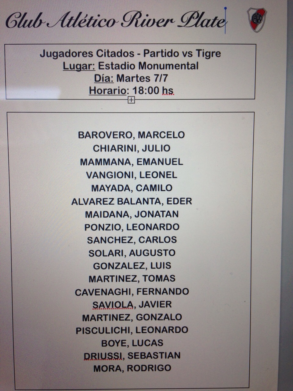 Se dio a conocer la lista de jugadores concentrados para el partido del miércoles en Victoria contra Tigre, y la gran novedad son los nombres de Javier Saviola y Lucho González.