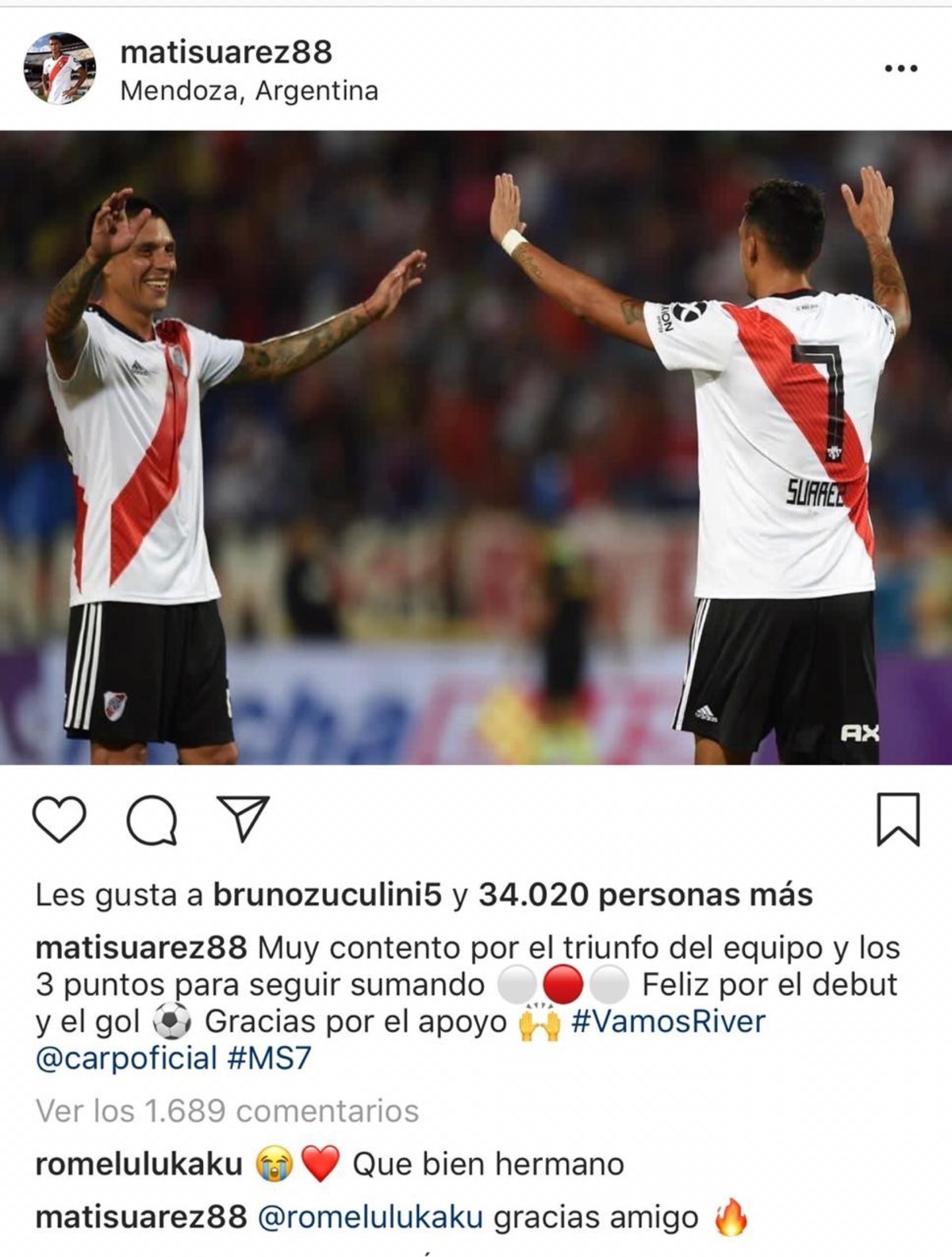 Después de publicar una foto en su cuenta de Instagram, el cordobés tuvo la respuesta de Romelu Lukaku, delantero belga que milita en el Manchester United, y quien compartió plantel con Suárez en el Anderlecht, cuando Lukaku recién comenzaba a brillar.