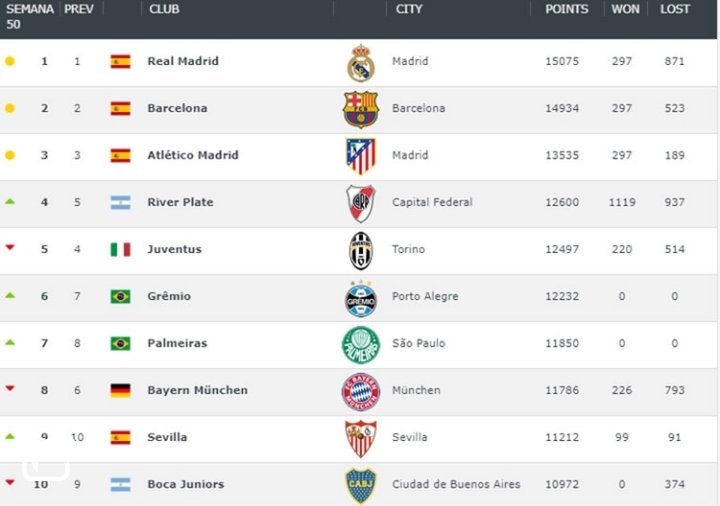 Más arriba, completando el top tres, están el Atlético Madrid (13535), Barcelona (14934) y el Real Madrid ocupando el liderato (15.075).