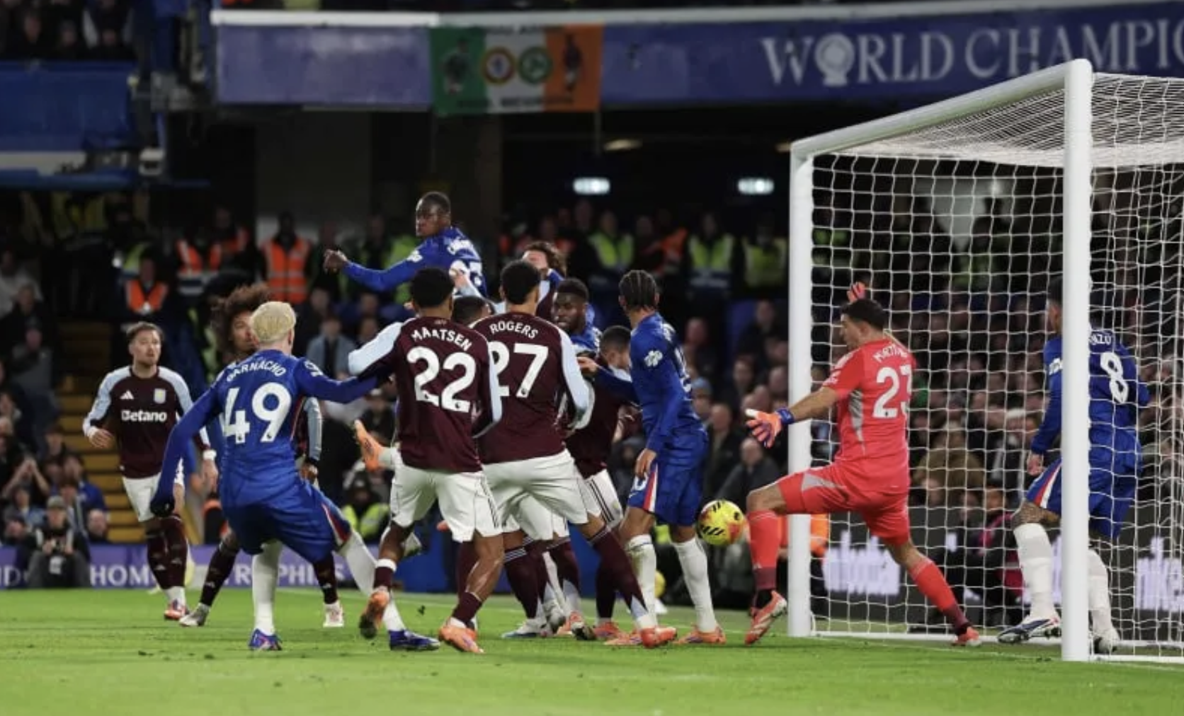 A los 37 minutos de la primera mitad, los de Enzo Maresca abrieron el marcador gracias a un tiro de esquina que contó con una avivada del ex-River. Antes de la ejecución de Reece James, el volante fue a molestar al Dibu en el área chica y se metió en el arco en el momento justo para que no le cobren infracción ni fuera de juego. El brasileño la desvió y sentenció el 1-0.