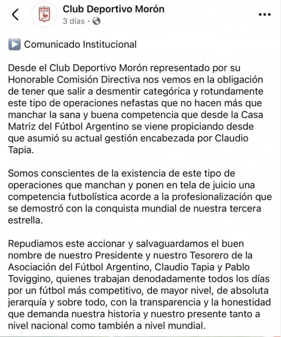 Lo curioso es que los dichos por los cuales se le imputa la sanción a Otta fueron negados vehementemente días atrás por su institución, que los calificó como “fake news”. “Nos vemos en la obligación de tener que salir a desmentir categórica y rotundamente este tipo de operaciones nefastas que no hacen más que manchar la sana y buena competencia que desde la Casa Matriz del Fútbol Argentino”, aseguró Morón.