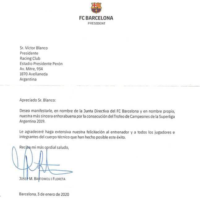 Racing Club y su presidente @Vbrvictor agradecen la nota de felicitación que @FCBarcelona_es y su presidente @jmbartomeu nos enviaran por la conquista del Trofeo de Campeones. Estas acciones nos estimulan a seguir por el camino de la excelencia 👏 pic.twitter.com/R7jmKwWfQg