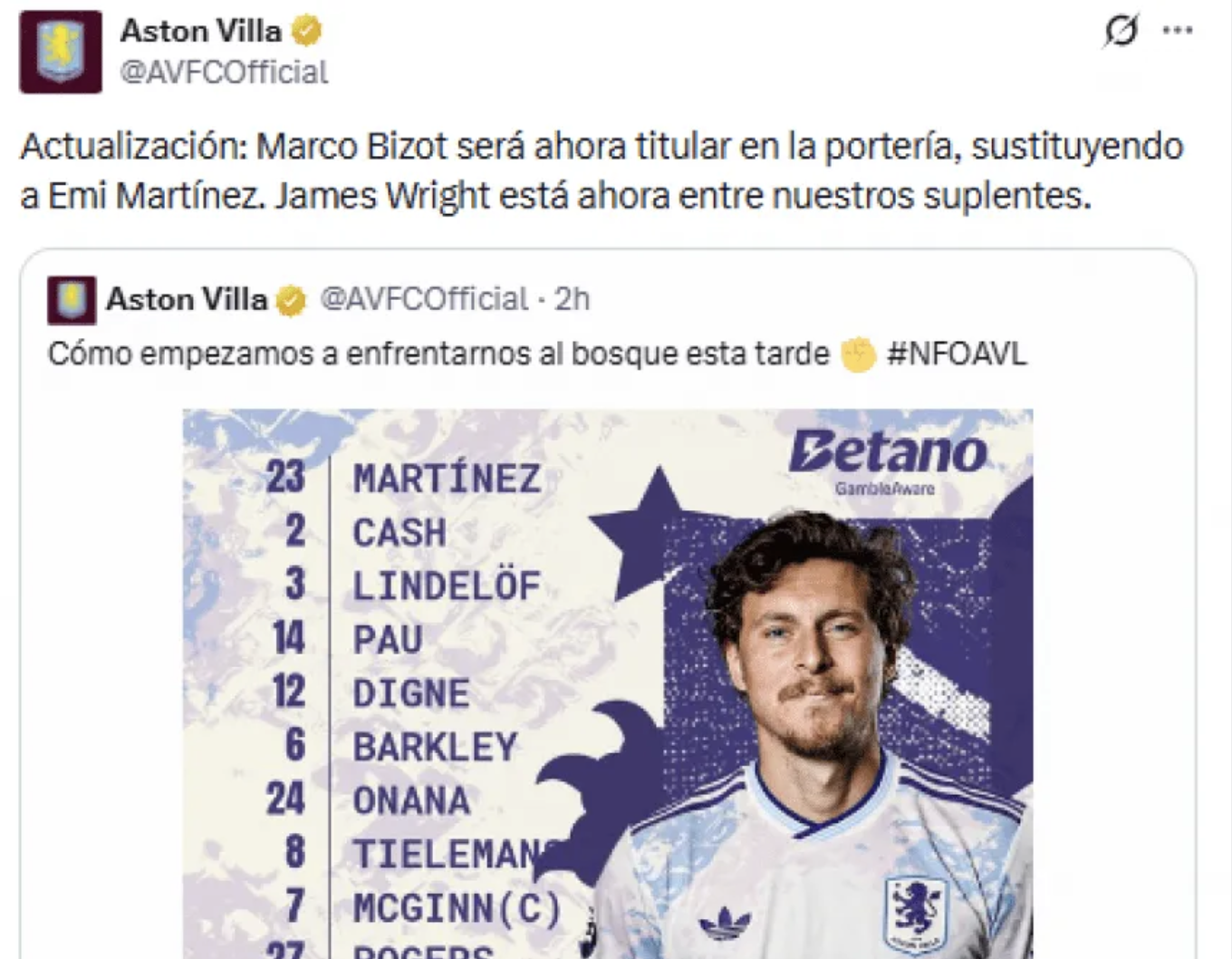 Emiliano Martínez no formó parte de la visita del Aston Villa a Nottingham Forest por la fecha 32 de la Premier League, que terminó 1-1, más allá de que la presencia del arquero argentino estaba confirmada. Una sobrecarga en el gemelo lo dejó afuera.