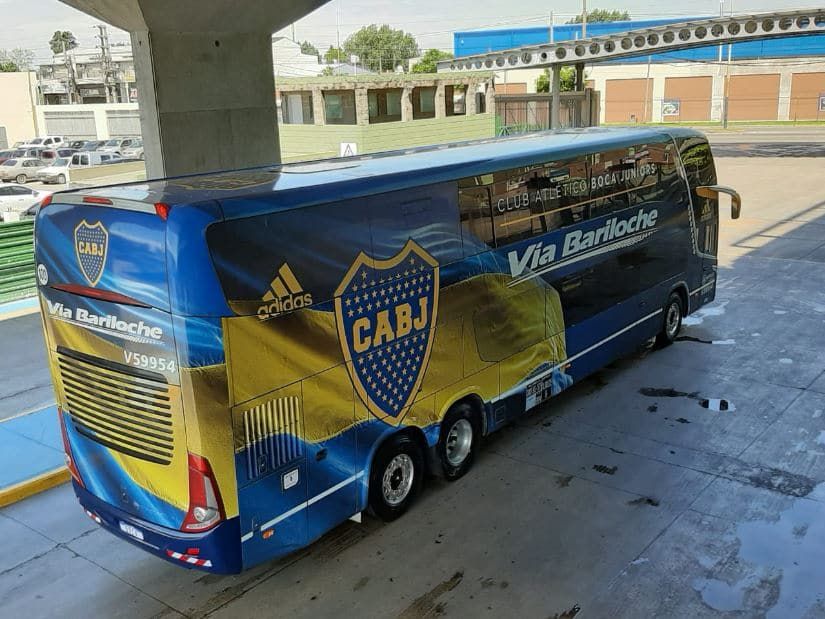 A partir de 2020, los movimientos por tierra del plantel del Xeneize estarán a cargo de Vía Bariloche, que preparó una unidad especial blindada con los colores azul y oro. Reemplazará a Flecha Bus.