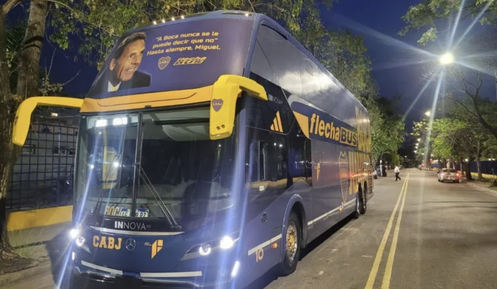 El micro de Boca que traslada a los jugadores presentó un ploteo en homenaje a Miguel Ángel Russo. Sobre la parte superior delantera del vehículo se observa una imagen del entrenador que falleció el miércoles y a su lado una de sus frases más conocidas dedicadas al Xeneize.