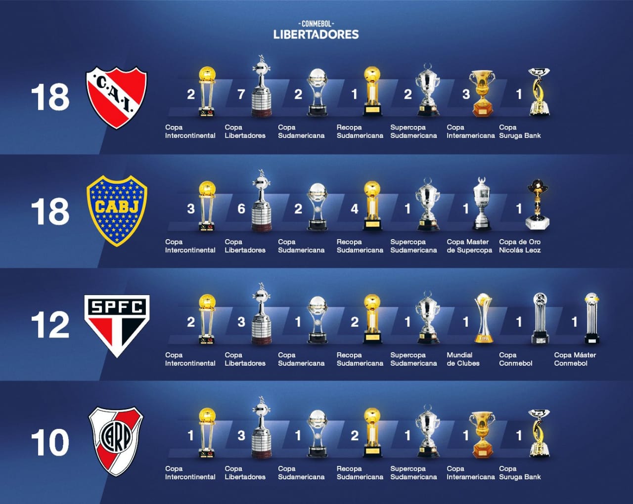 Los 18 títulos del Rojo son: 7 Libertadores, 3 Interamericanas, 2 Intercontinentales, 2 Supercopas, 2 Sudamericanas, 1 Recopa, y 1 Suruga Bank.