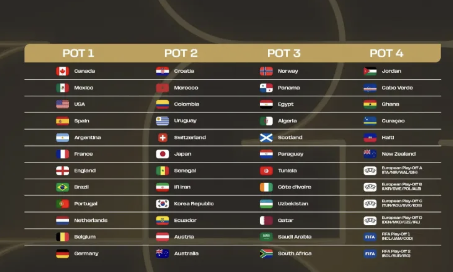Además, conforme al calendario, los países anfitriones contarán con pelotas de distintos colores (México con posición A1, verde; Estados Unidos con posición D1, azul; y Canadá con posición B1, rojo). “Las otras nueve selecciones del bombo 1 se identificarán mediante nueve bolas del mismo color y se asignarán automáticamente a la posición del grupo en el que resulten encuadradas“, según informa el comunicado.