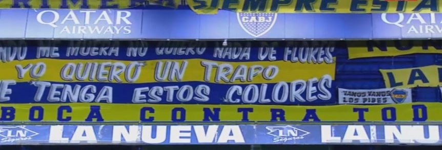 Durante el encuentro de ayer por la noche, se pudo ver una bandera en las tribunas de La Bombonera que se robó el protagonismo de la noche. En la misma se pudo ver con claridad una fuerte frase: “Boca contra todos, todos contra Boca“.