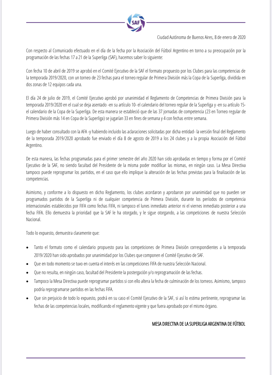 En ese escrito la Superliga detalla, entre más, que la mayoría de los clubes que la componen dieron consentimiento al desarrollo del calendario que abarca 33 fines de semana, con cuatro jornadas entre semana, entre el campeonato propiamente dicho y la Copa de la Superliga, remarcando que efectivamente siempre se tuvieron en cuenta las competiciones FIFA (el Preolímpico y los Juegos de Tokio 2020 no lo son).