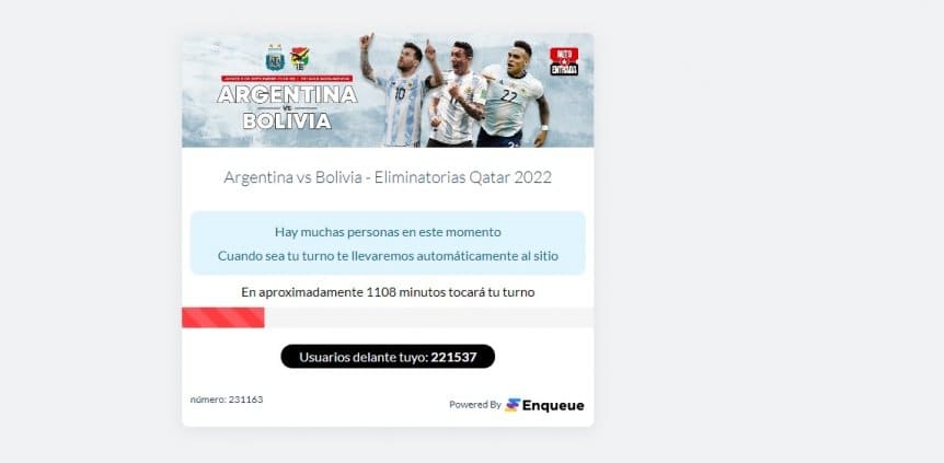 La plaforma explotó incluso antes de las 13, cuando inició el expendio de los 17 mil tickets disponibles para los fanáticos. En un principio, a los usuarios les figuraba un lugar en la cola virtual. Sin embargo, con el correr de los minutos nadie “avanzaba”. Por el contrario: muchos “retrocedieron”.