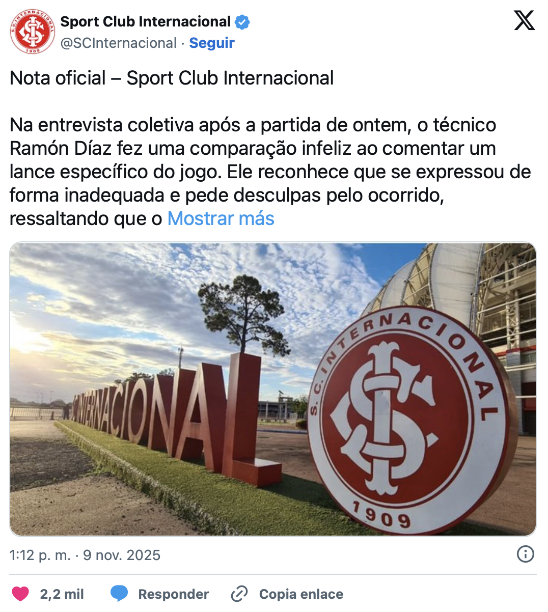 La frase de Díaz, pronunciada en medio de un reclamo por un gol anulado a Johan Carbonero, se viralizó rápidamente. El comentario generó rechazo inmediato tanto en medios brasileños como en redes sociales, donde se multiplicaron las críticas hacia el exentrenador de River, San Lorenzo, Corinthians, entre otros.
