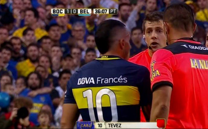 Tevez abrió la cuenta con un golazo y luego se fue expulsado por una infracción que le valió la amarilla de Delfino.