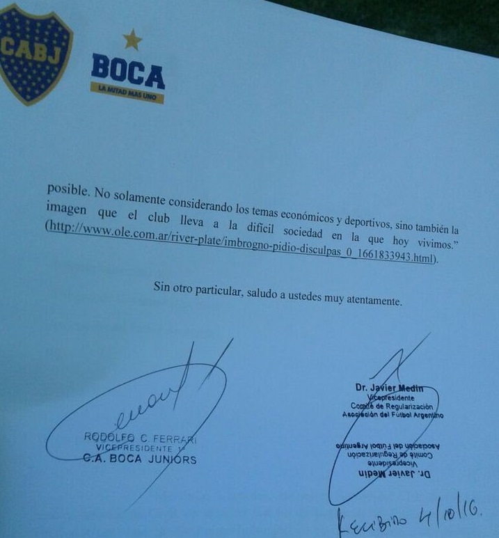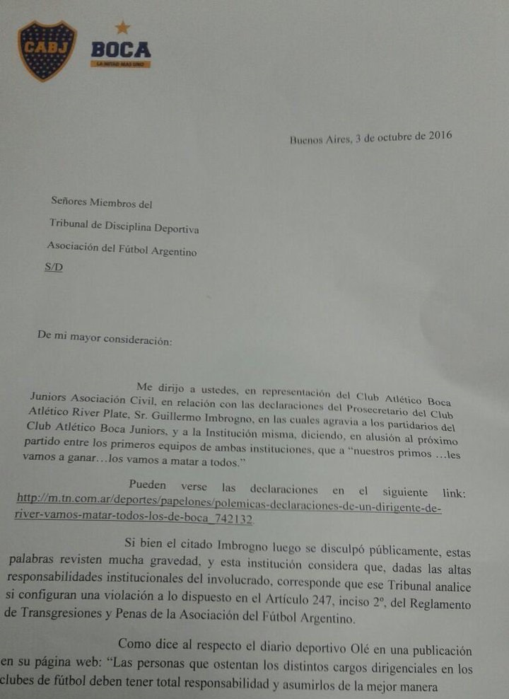 Esta fue la nota presentada por Boca ante el Tribunal de Disciplina de AFA, solicitando que se analice el comportamiento del dirigente de River, Guillermo Imbrogno.