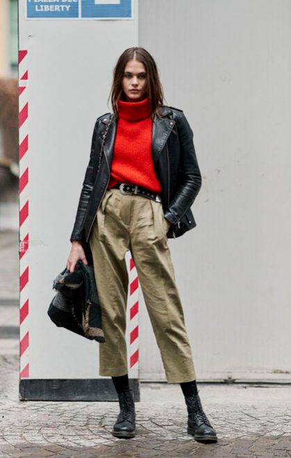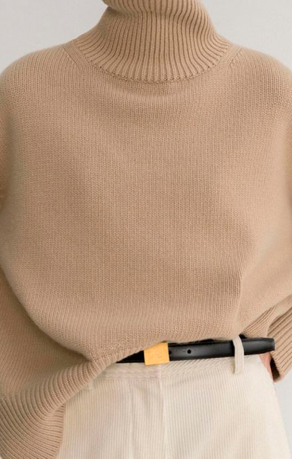 Si la polera es del mismo tono que el pantalón o de un tono en la misma gama, creá un corte con un cinturón de cuero negro y hebilla dorada.